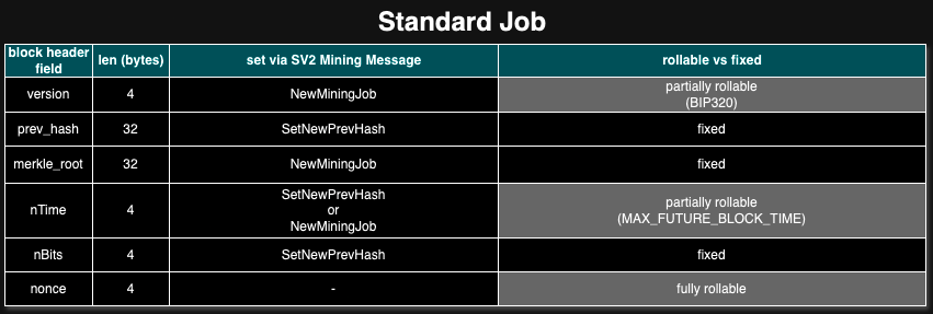 This separation vastly simplifies the protocol implementation for clients that don’t support Extended Job, as they only need to implement the subset of protocol messages related to Standard Job (see Mining Protocol Messages for details).